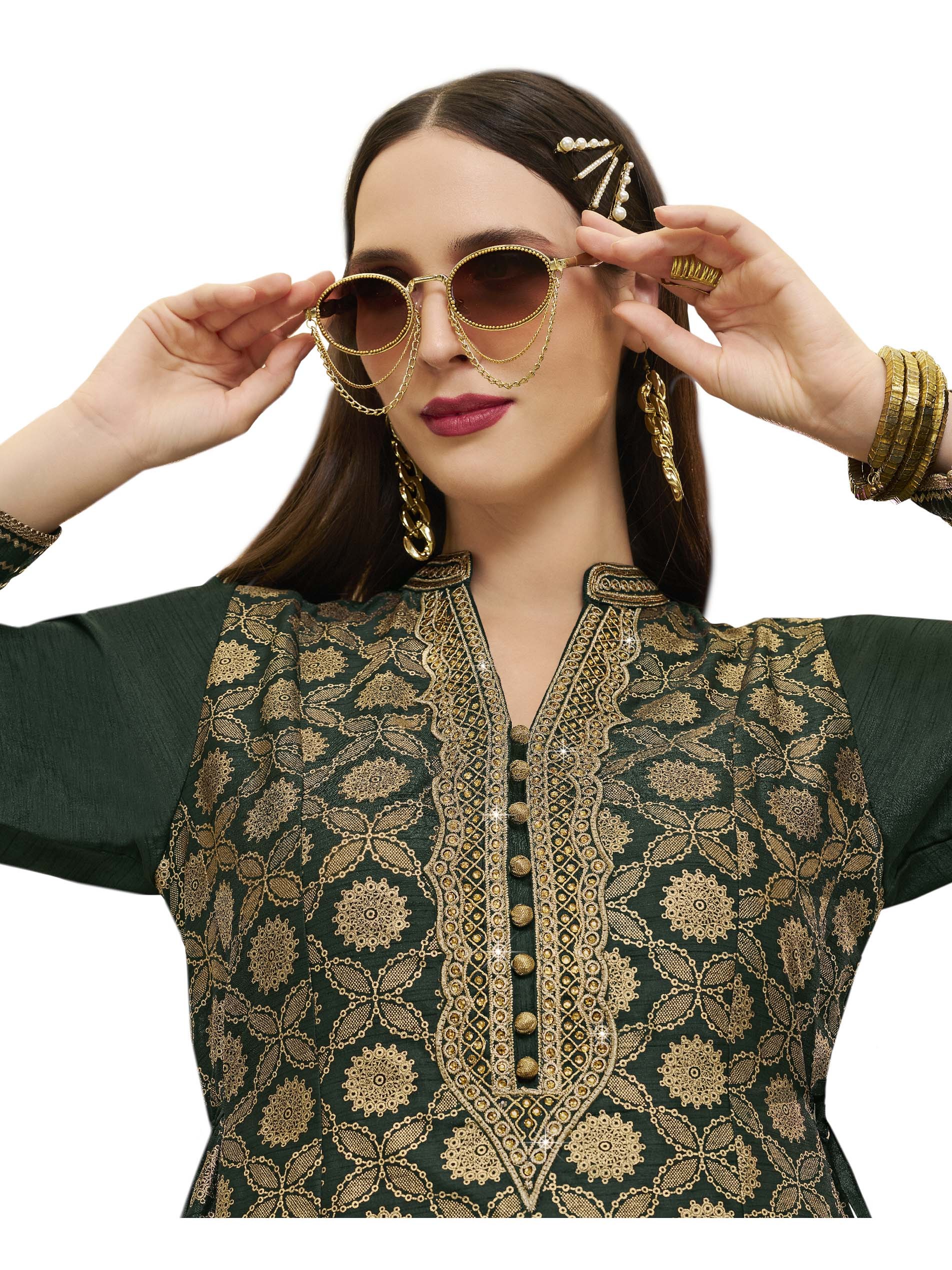 Royal green cotton jalabiya, designed with golden artwork and unique white patterns with long sleeves and front buttons.
