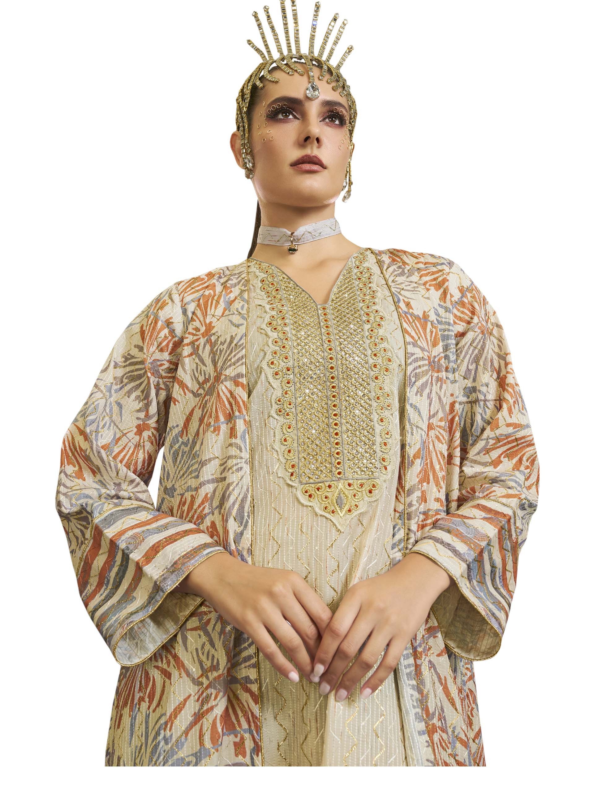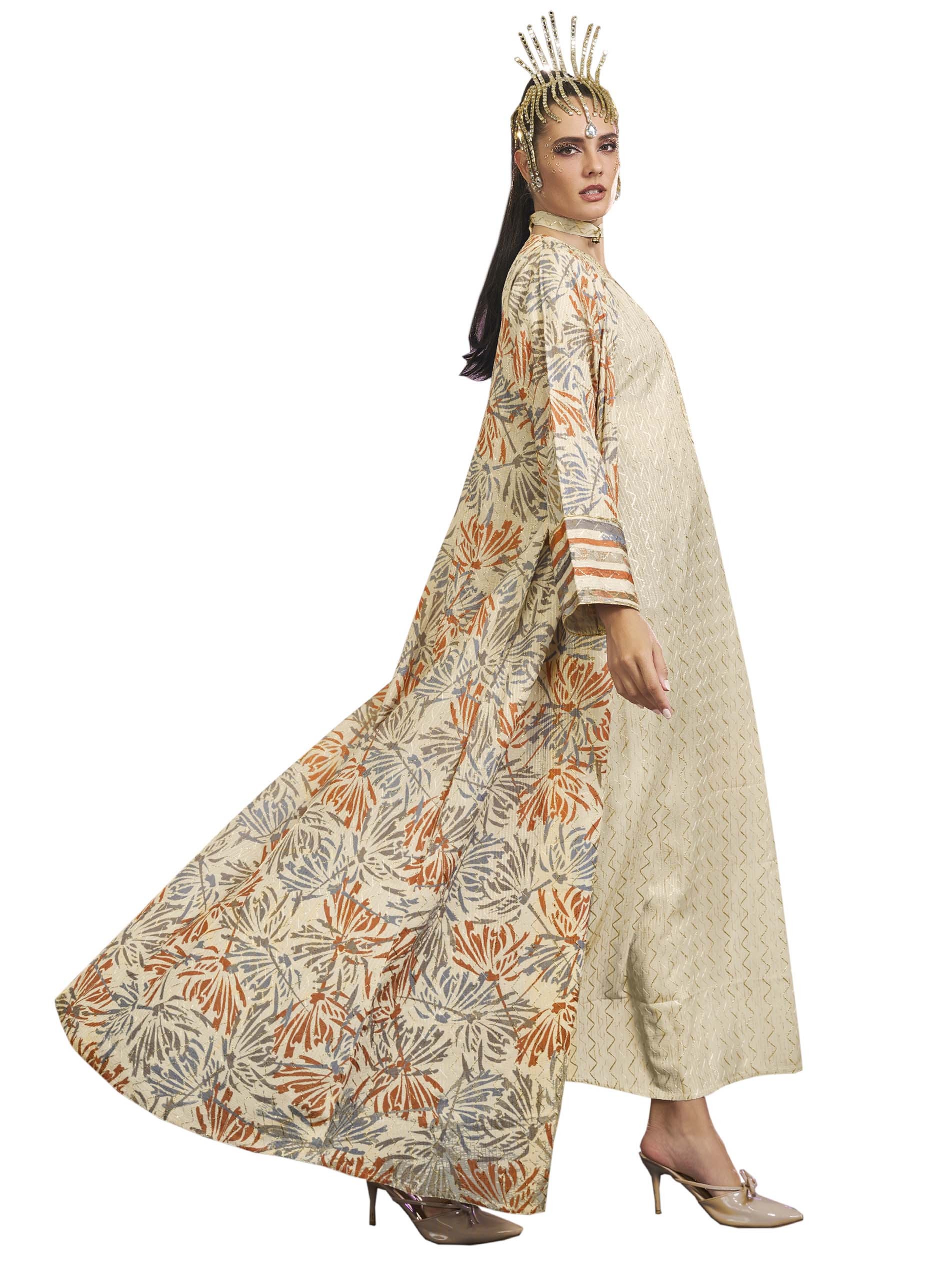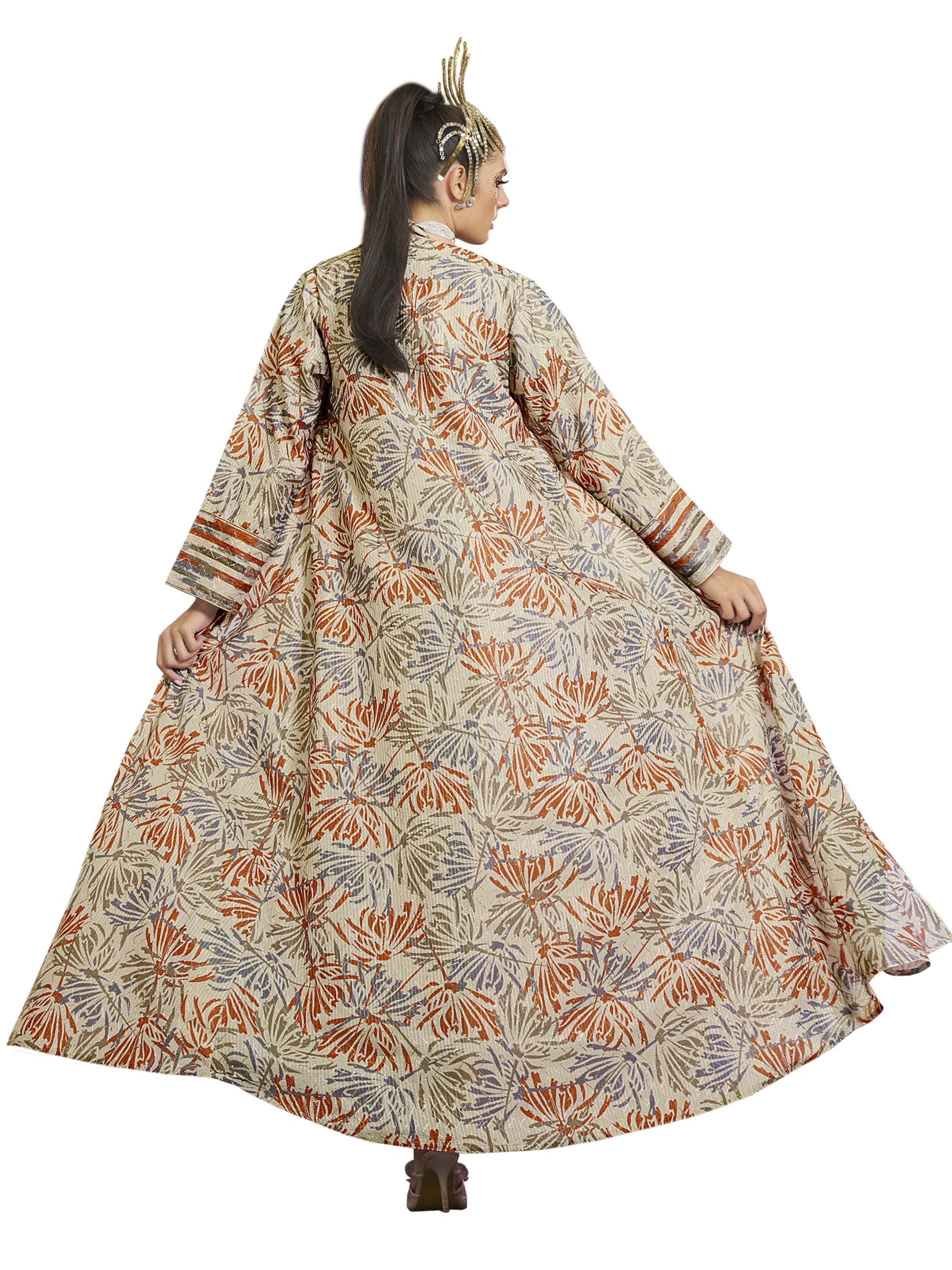 A printed cotton jalabiya that comes in cheerful gray and orange colours on the side, featuring unique orange and gold chest artwork.