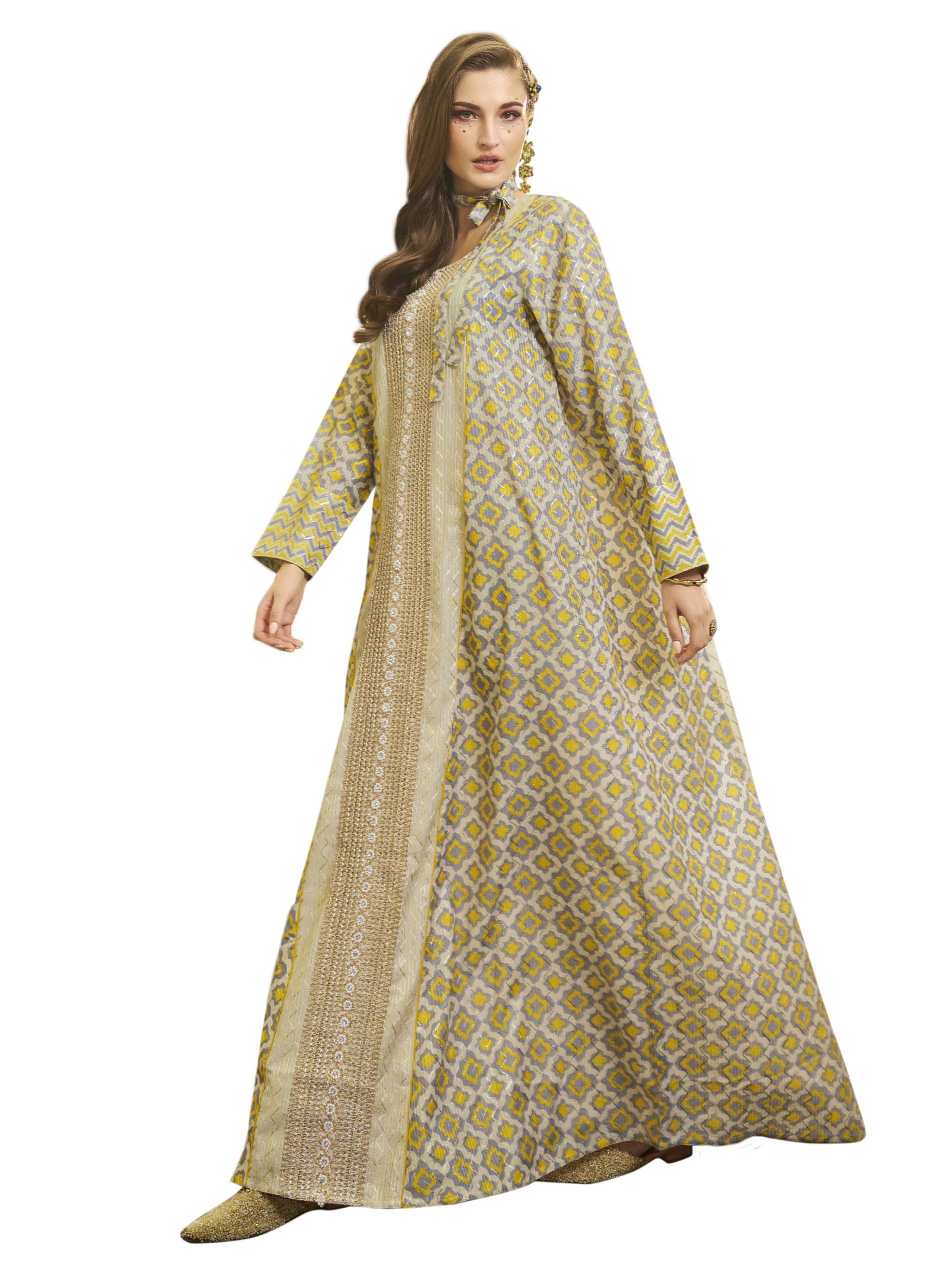 Steal the show with your distinctive ramadan look in Sara's printed cotton jalabiya that comes with yellow and gray colours, finished with long sleeves and elegant rounded neck cut.