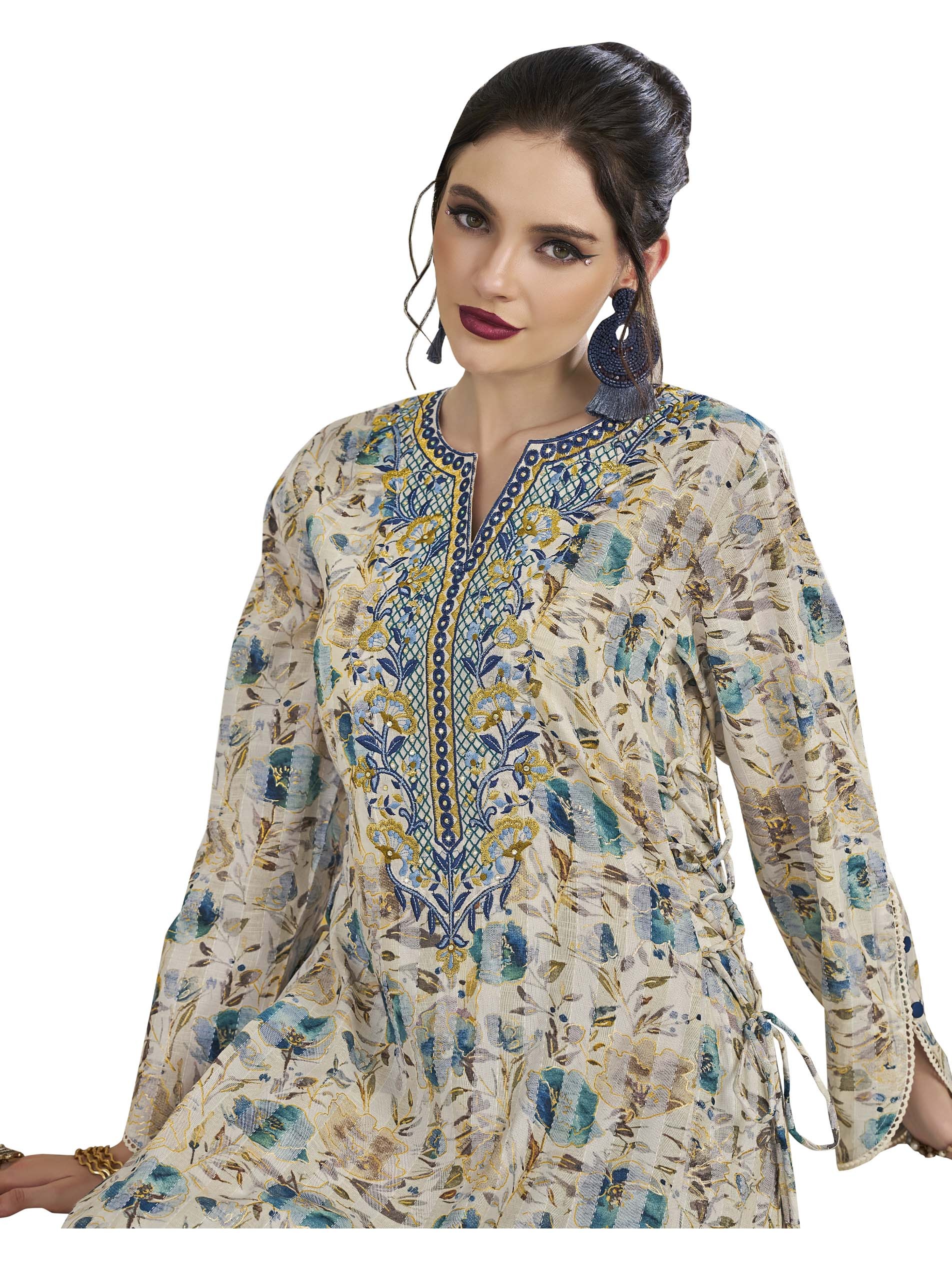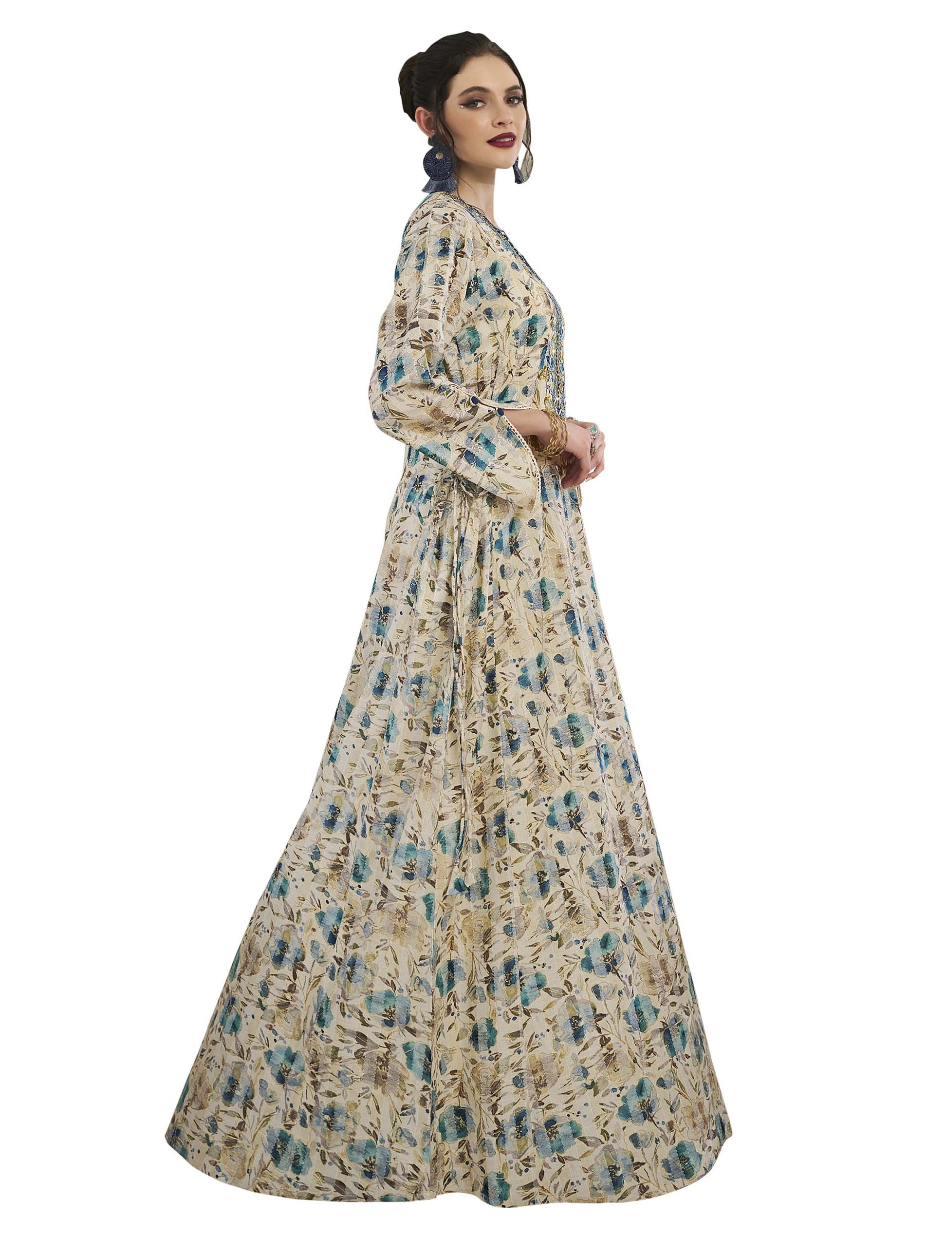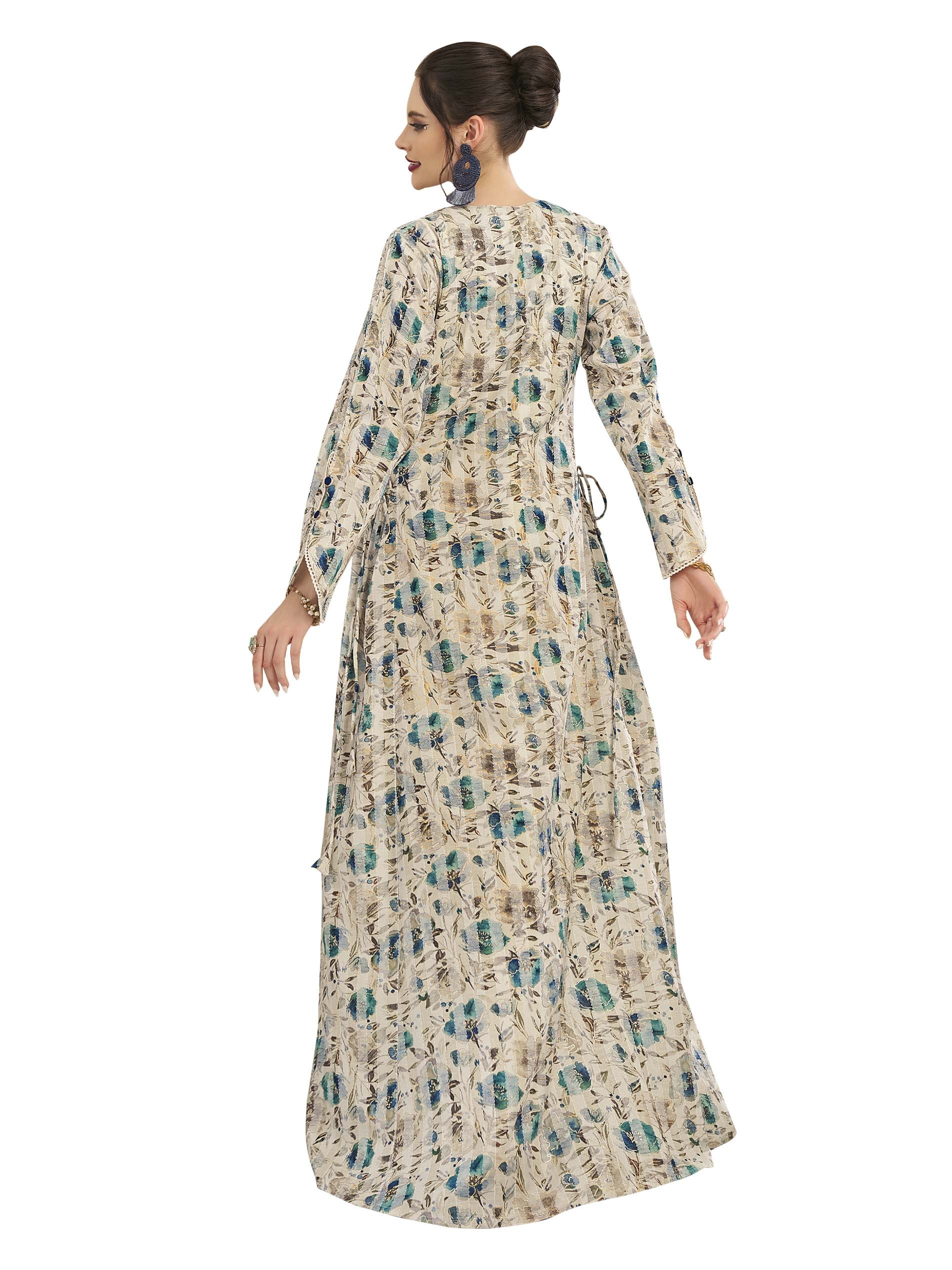 You must add this artistic piece to your wardrobe to highlight your feminity! This long sleeve gray and blue floral cotton jalabiya is desgined with blue and gold artwork on the chest for a unique look in occassions.
