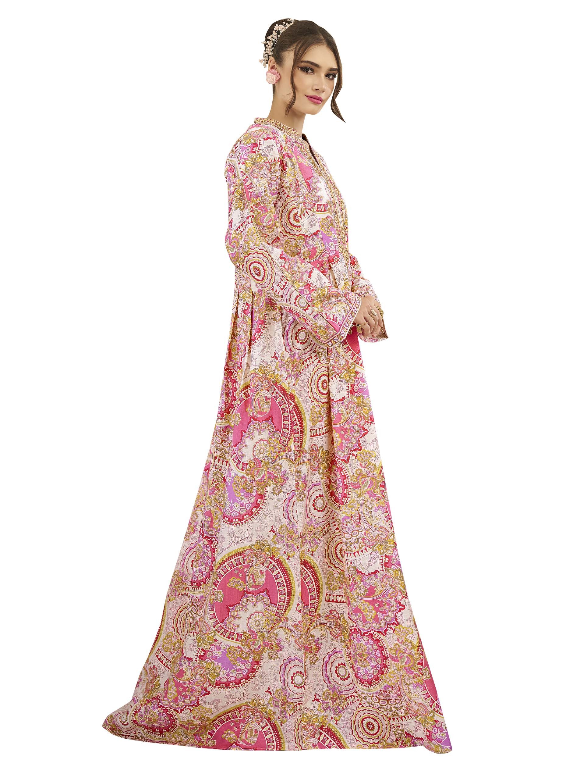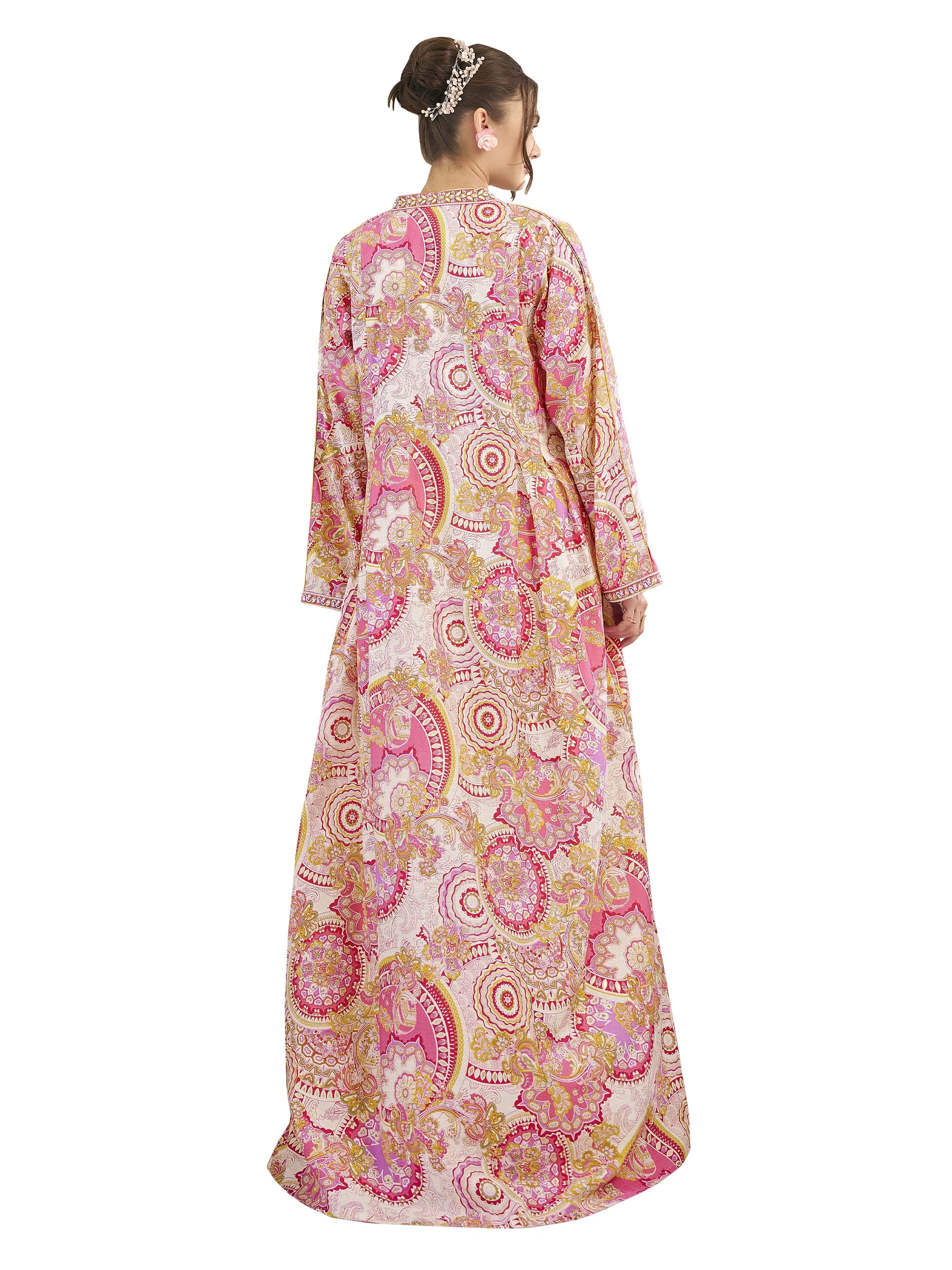 Step into luxury with our long sleeve maxi jalabiya that comes in white and pink colors, featuring intricate gold artwork and detailed chest embroidery.