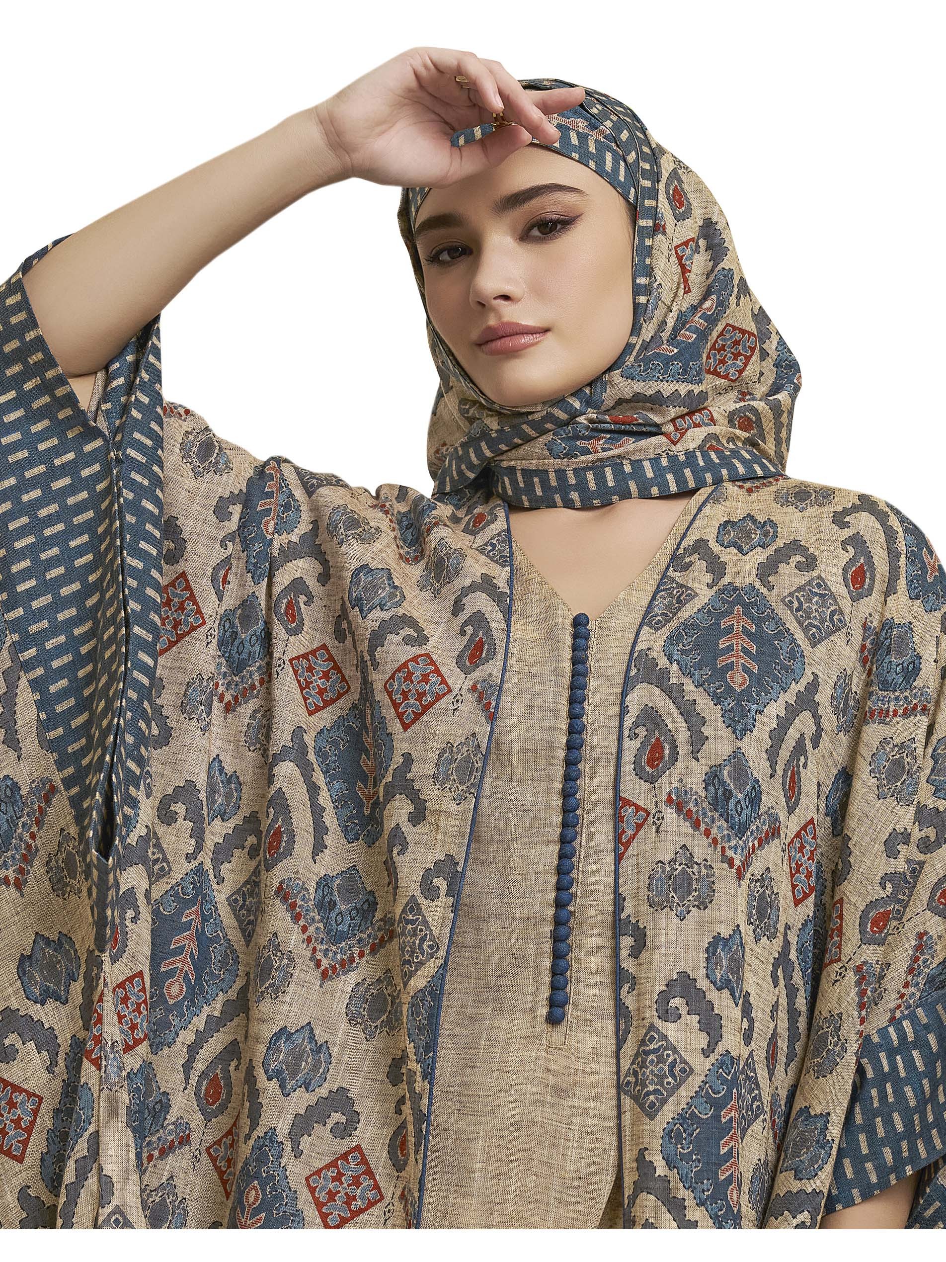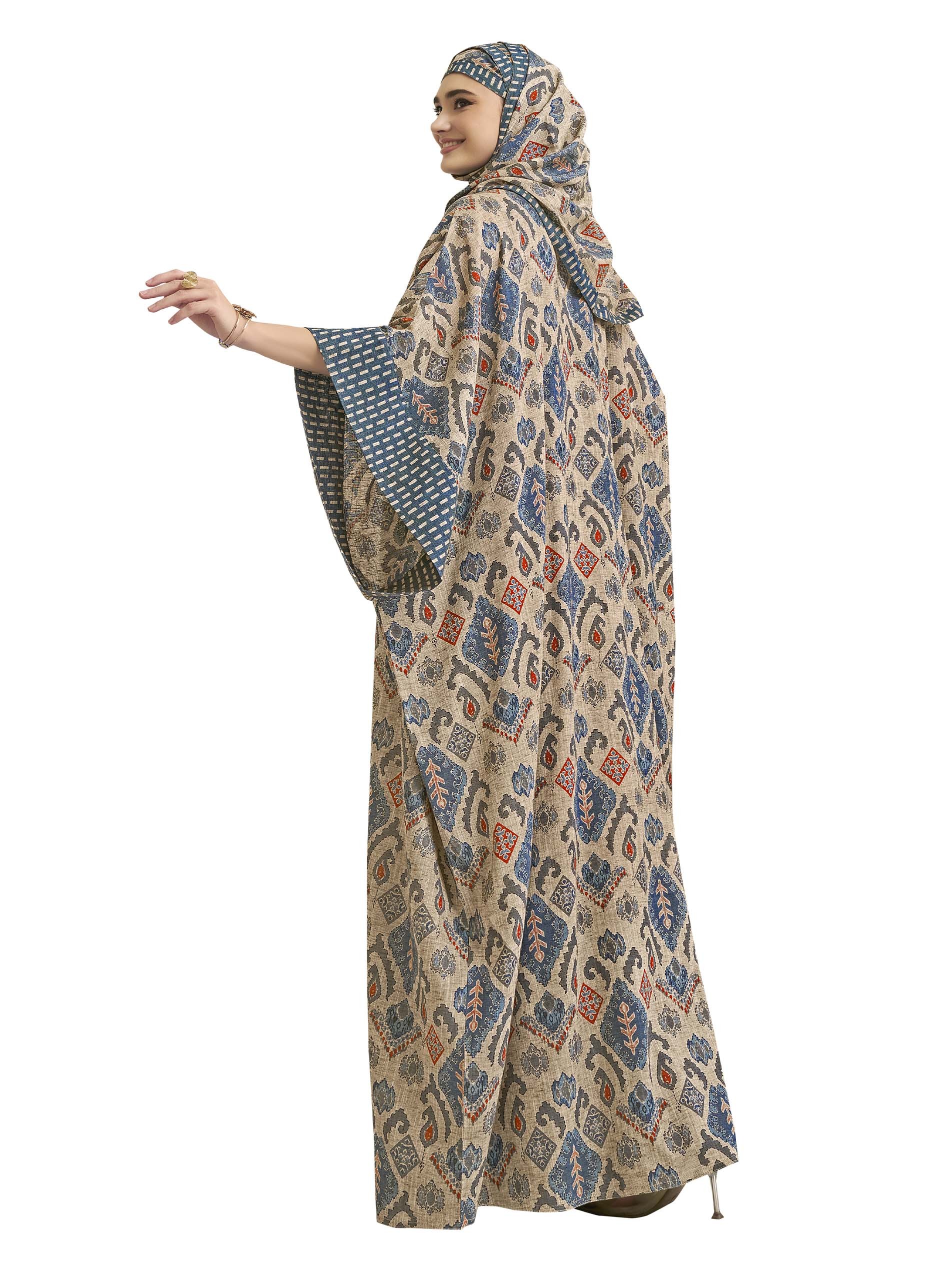 An A-line cotton jalabiya, designed with a plain gray layer and the design is completed with another open layer with multiple patterns and chest blue front buttons.