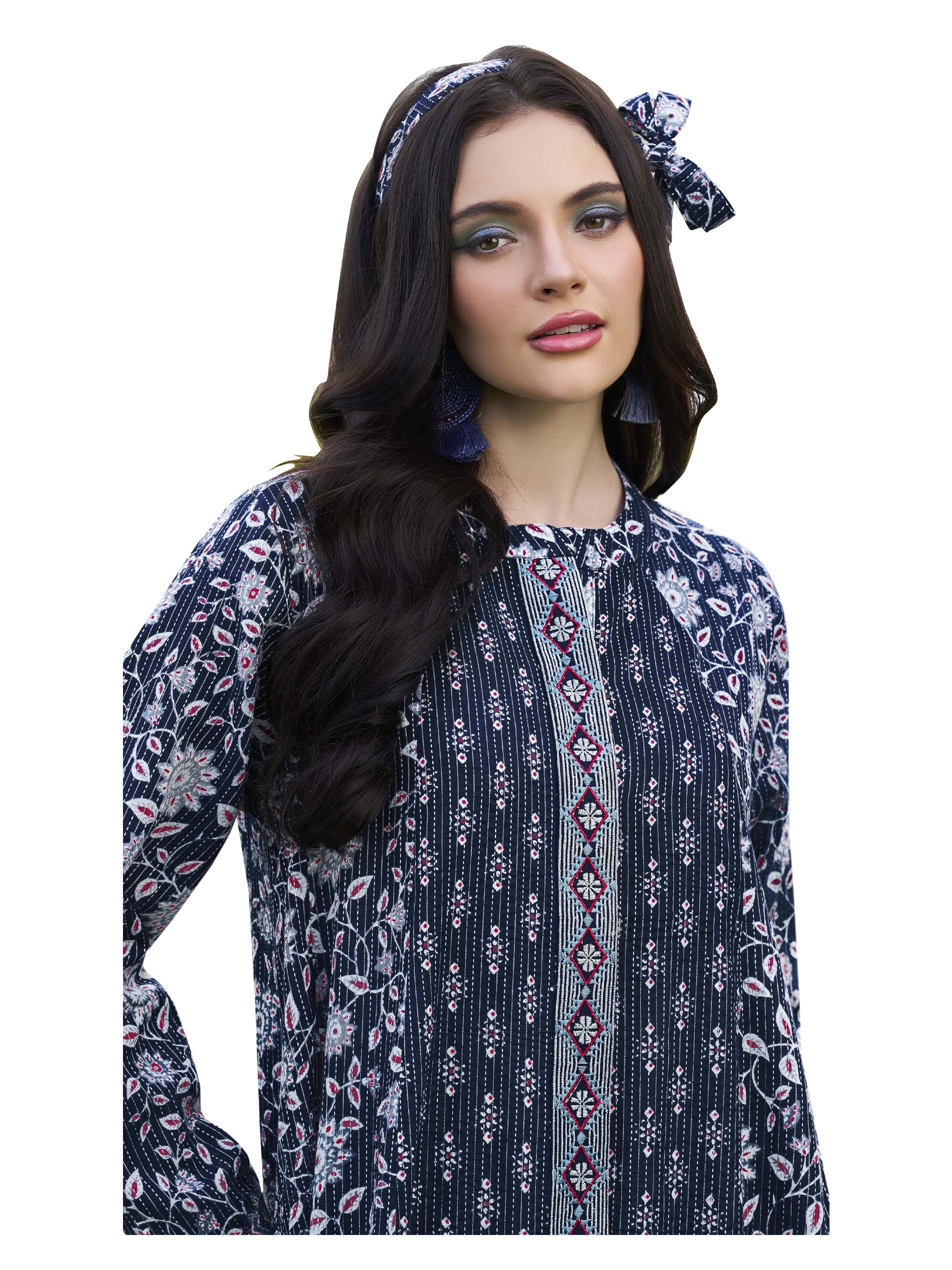 Sara's long maxi blue cotton jalabiya is designed with white floral print for a charming look.