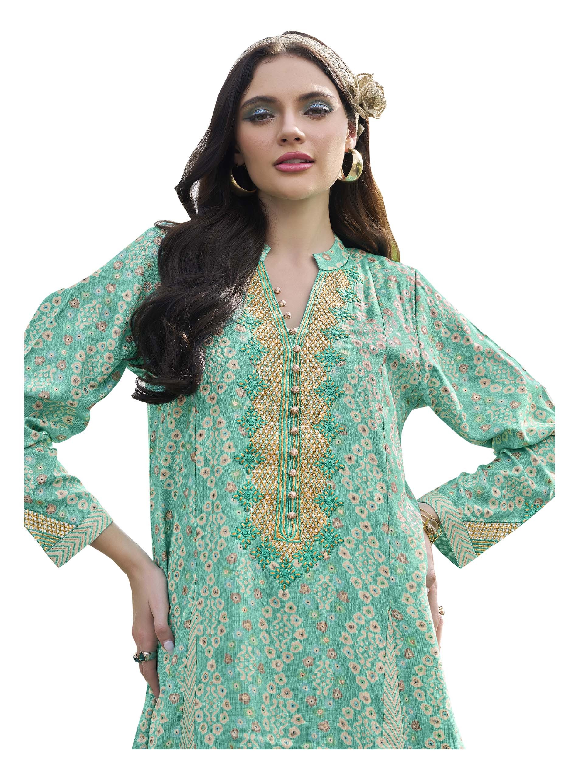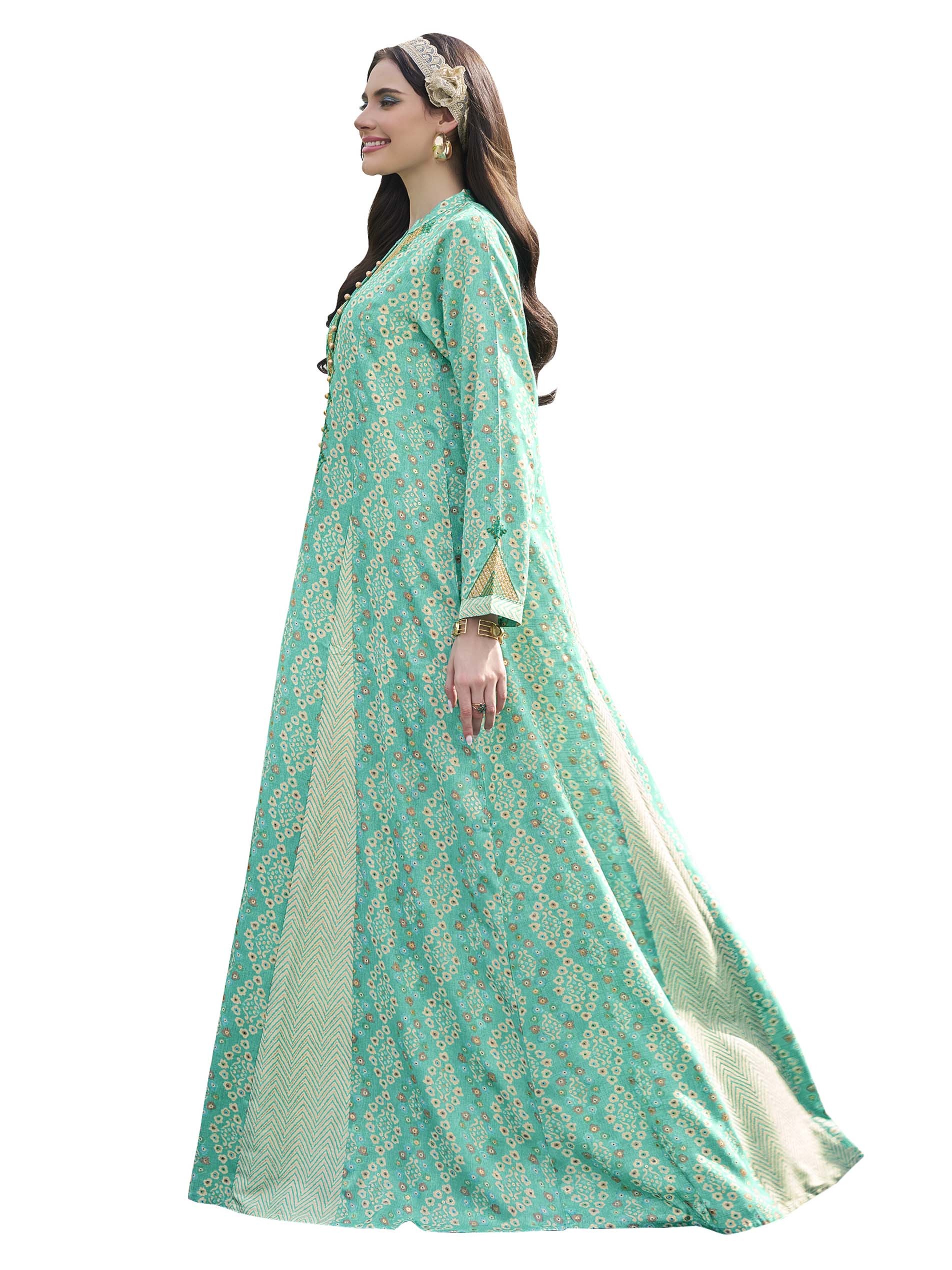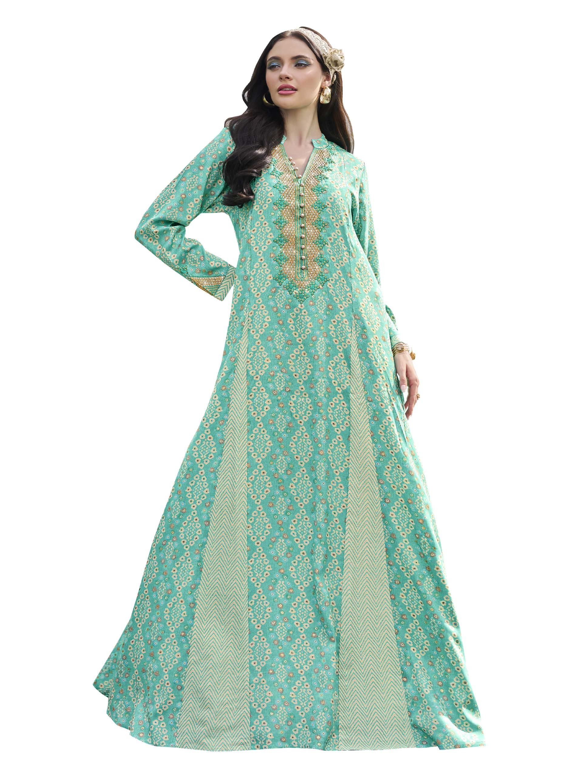 Shine is this sky blue cotton jalabiya, designed with white floral & zigzag pattern, completed with chest gold artwork and front buttons.