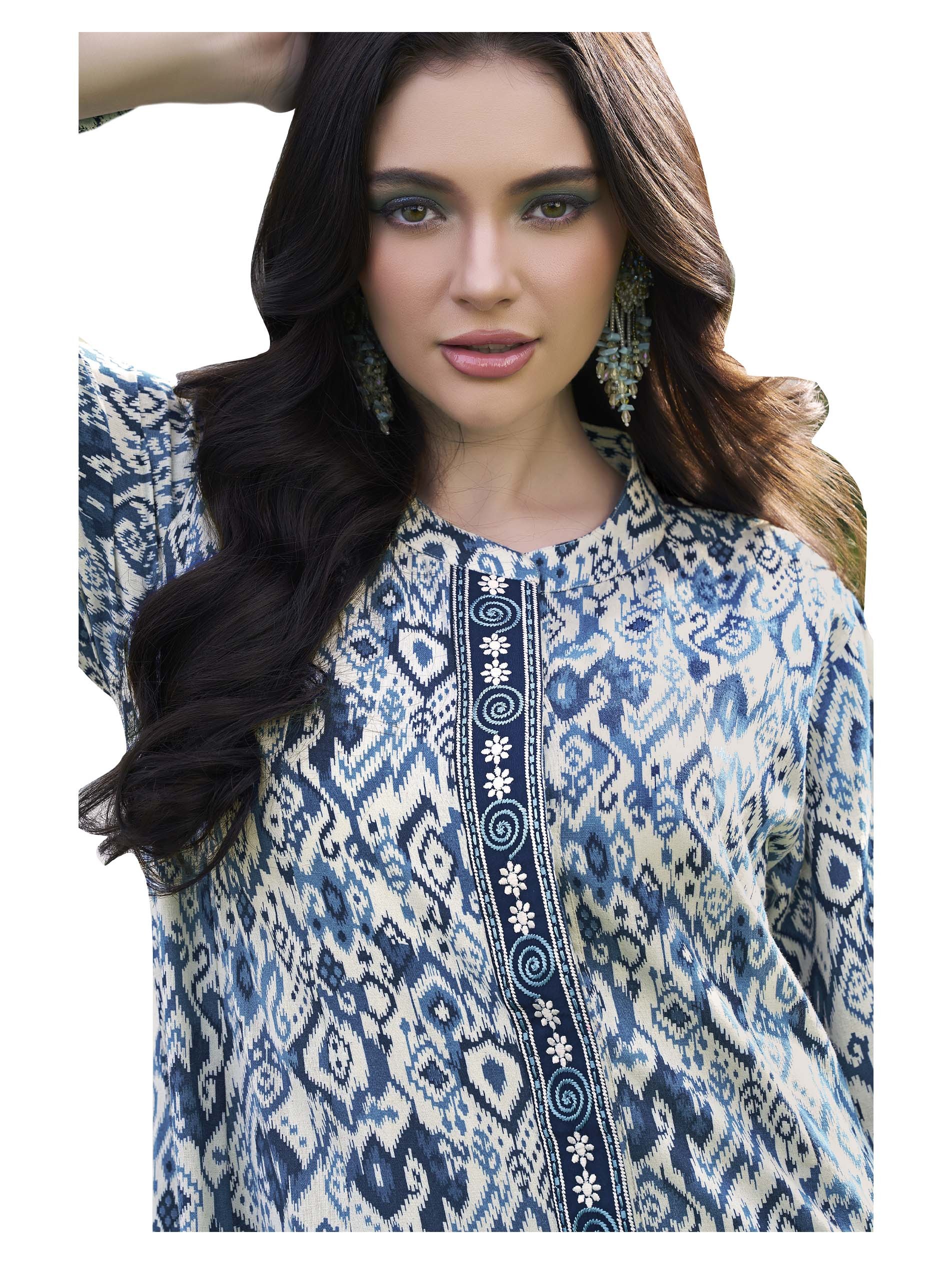 Sara's long sleeve cotton jalabiya with blue and white pattern designs offer you with the feeling of comfort, charm and elegance.