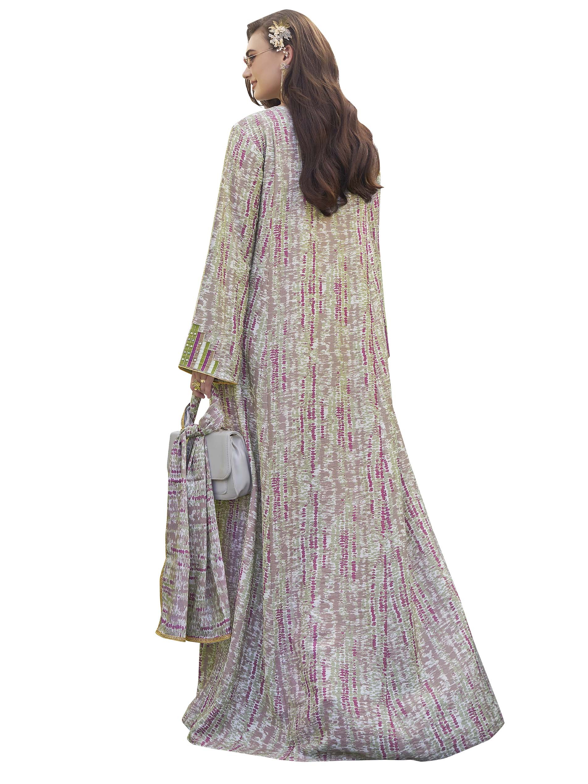 Long sleeve cotton jalabiya, featuring spectacular design and chest emboridery with green and purple color with gold buttons.