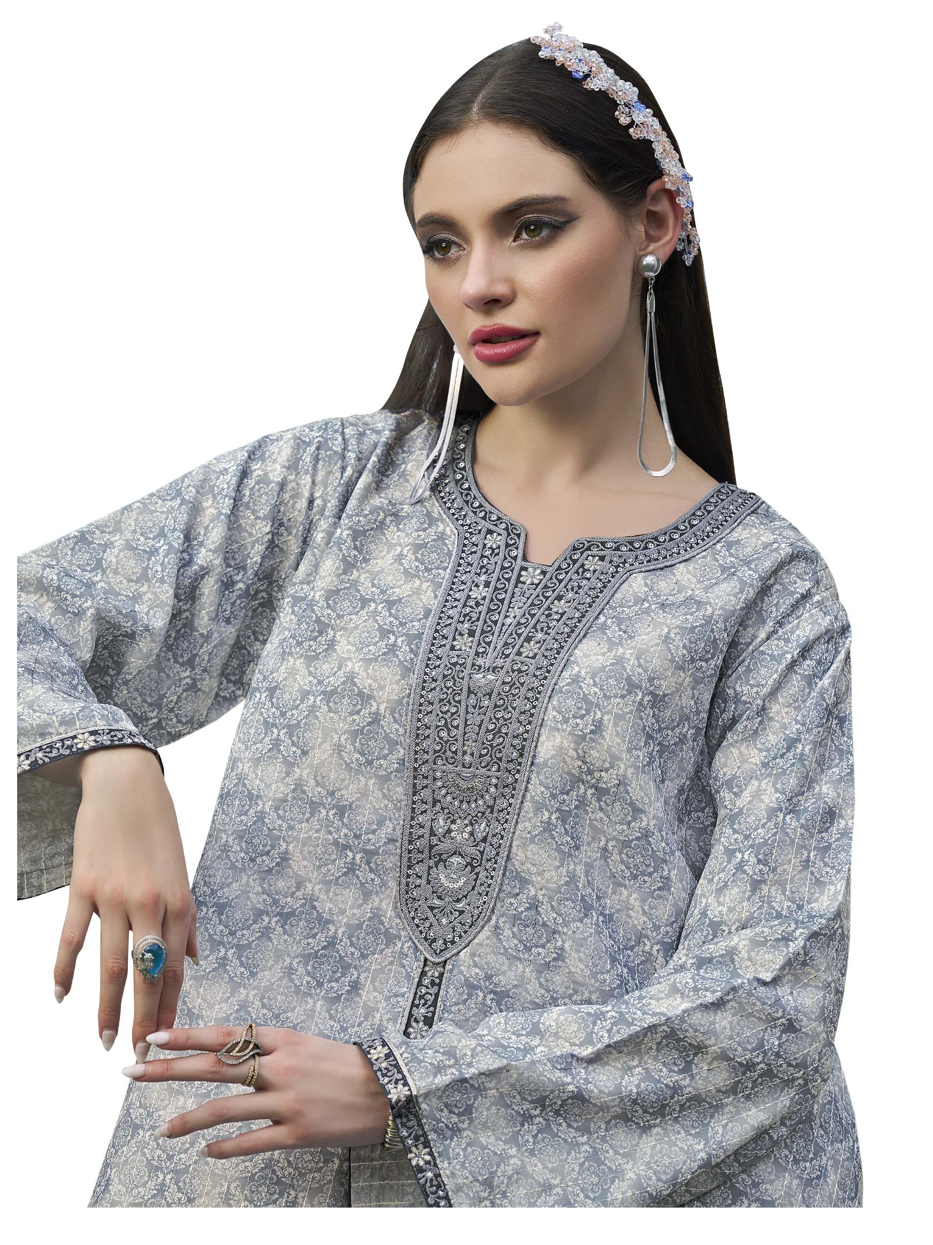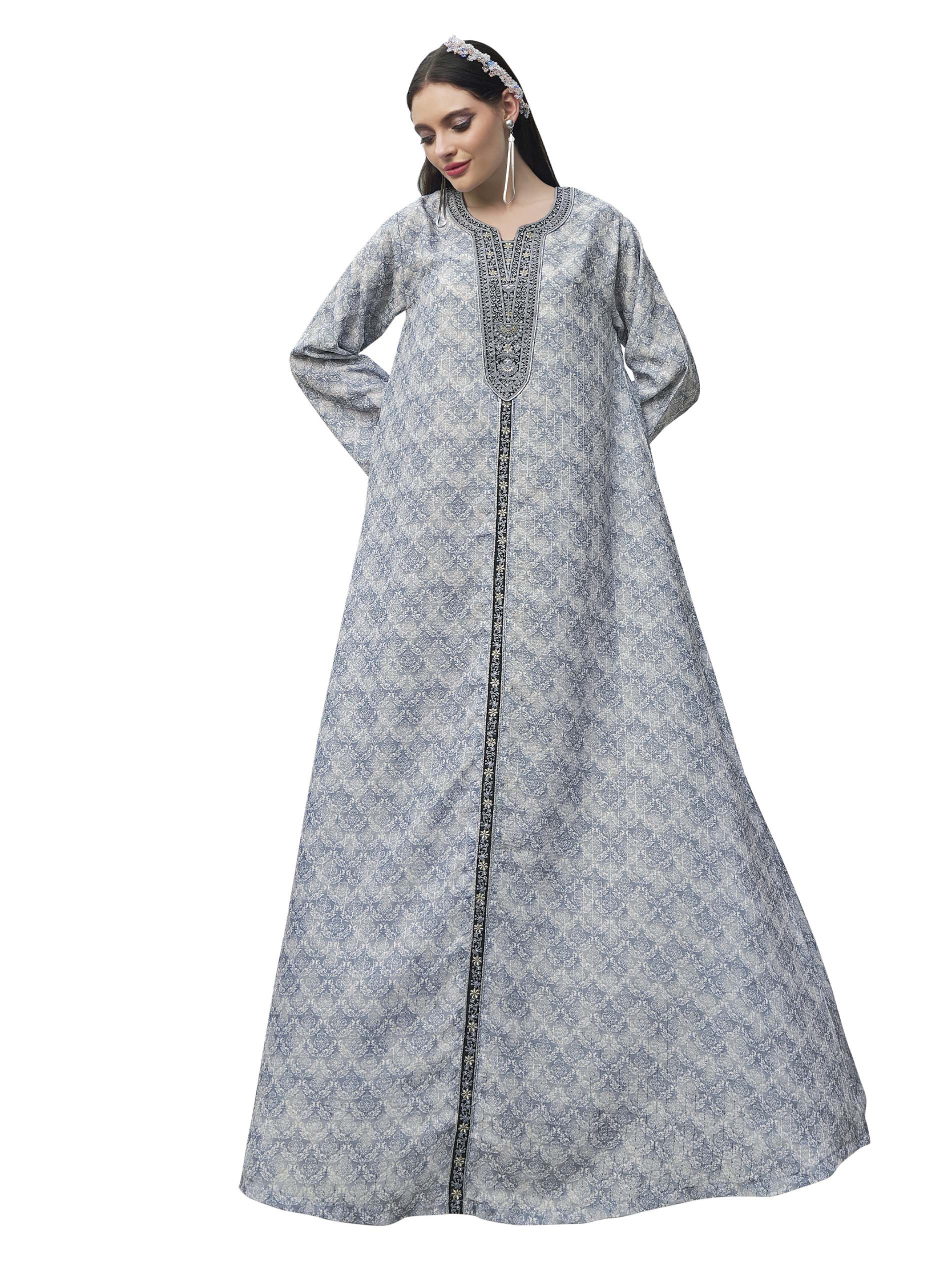 This long sleeve cotton jalabiya is the perfect choice for simplicity lovers, designed with blue and white floral print and spectacular chest embroidery.