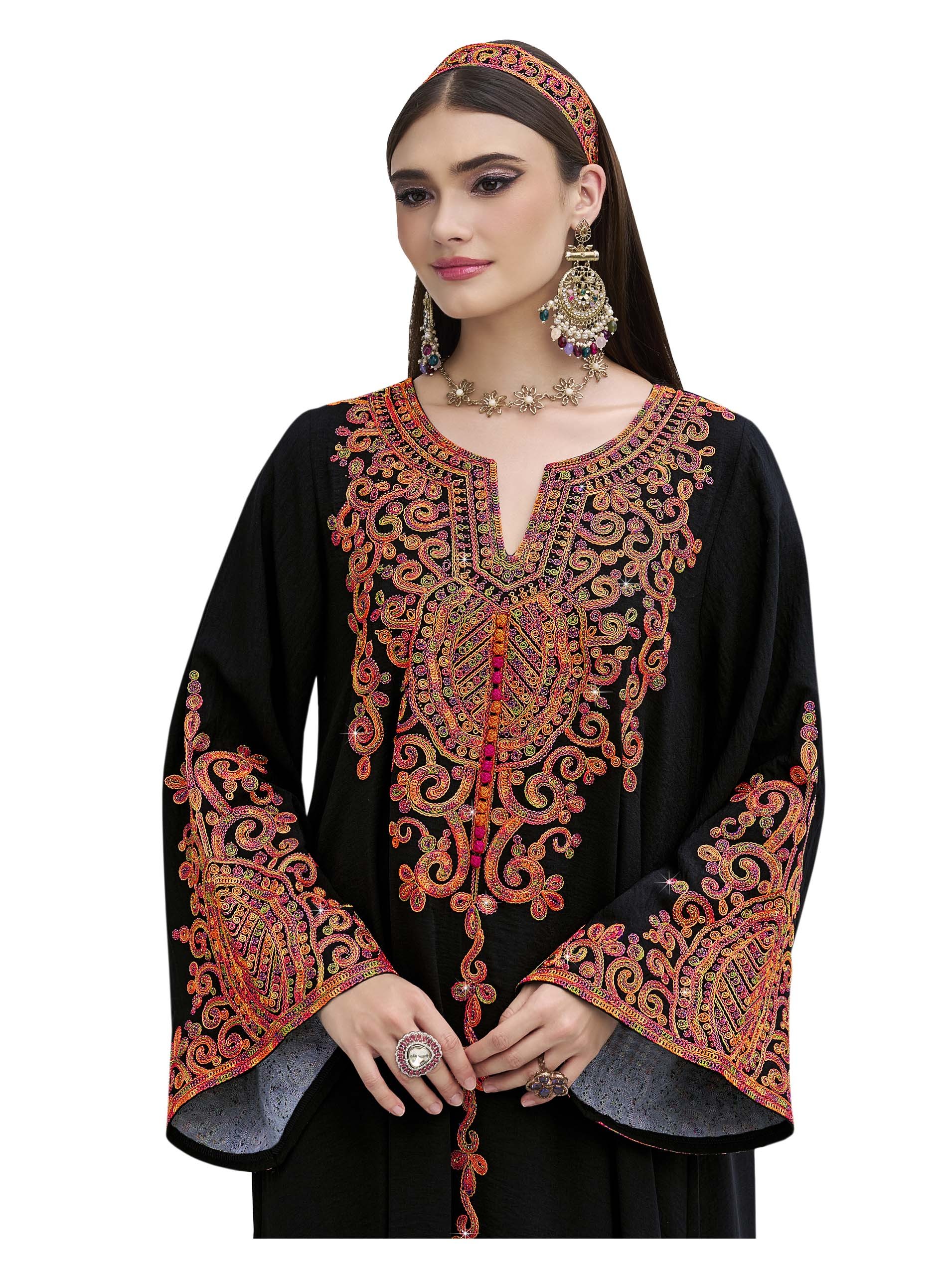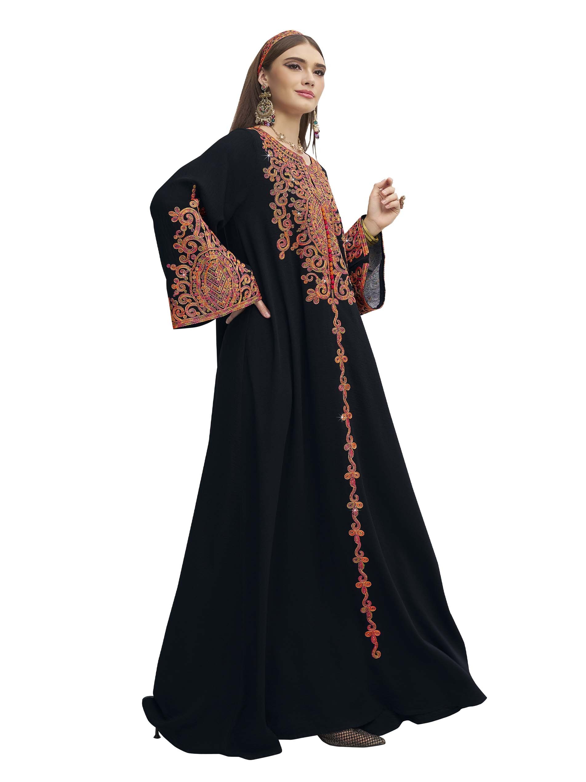 Shine in this black cotton jalabiya, adorned with colorful sleeve and chest embroidery for a distinctive Ramadan look.